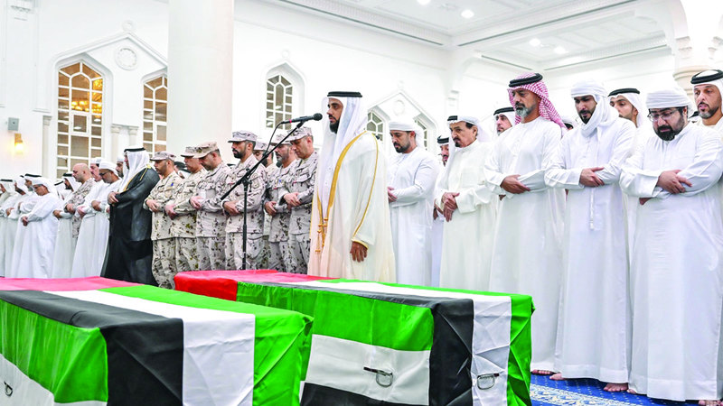 حاكم عجمان وولي عهده يؤديان صلاة الجنازة على جثماني شهيدي الوطن ناصر البلوشي وعبدالعزيز الطنيجي