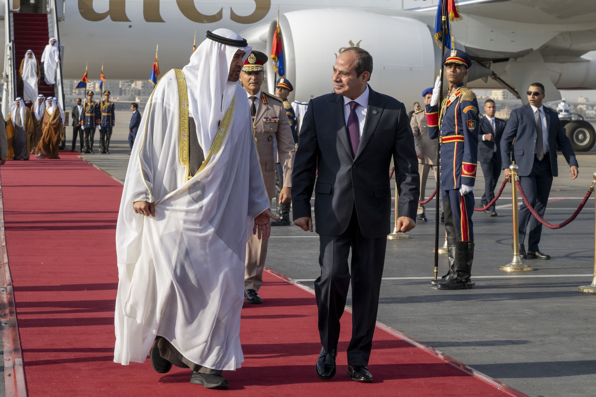 ورحب الرئيس المصري - خلال استراحة قصيرة في قاعة كبار الزوار في المطار- بصاحب السمو الشيخ محمد بن زايد آل نهيان والوفد المرافق في مصر .. مؤكدين عمق العلاقات الأخوية التي تجمع البلدين وأهمية زيارة سموه في تعميق هذه العلاقات وفتح مسارات جديدة للتعاون المشترك بما يعود بالخير والنماء على شعبي البلدين.