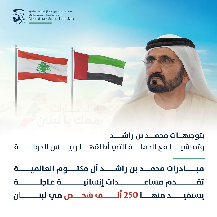 وجه صاحب السمو الشيخ محمد بن راشد آل مكتوم، نائب رئيس الدولة رئيس مجلس الوزراء حاكم دبي، رعاه الله، بتقديم مساعدات غذائية عاجلة إلى الشعب اللبناني الشقيق، عن طريق مؤسسة "مبادرات محمد بن راشد آل مكتوم العالمية"، لمساعدته على مواجهة الظروف الإنسانية الصعبة بسبب الأحداث الراهنة التي تمر بها الجمهورية اللبنانية الشقيقة.