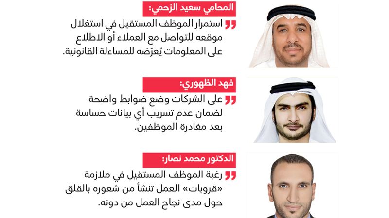 وأفاد مستشارون قانونيون بأن استمرار الموظف المستقيل في استخدام معلومات العمل بعد مغادرته المؤسسة، وبقاءه في قنوات التواصل المخصصة لجهة عمله السابقة، سواء على مواقع التواصل الاجتماعي أو على برامج الاجتماعات «عن بُعد»، قد يعرّضه للمساءلة القانونية، بسبب إمكانية الوصول إلى معلومات قد تؤثر في خصوصية جهة العمل، أو مشاركة بيانات غير مصرح بها، موضحين أنه على الموظف - بمجرد استقالته أو إنهاء خدماته من العمل - الخروج من جميع الحسابات والمجموعات المرتبطة بهذه الجهة، فور انتهاء العلاقة الرسمية.