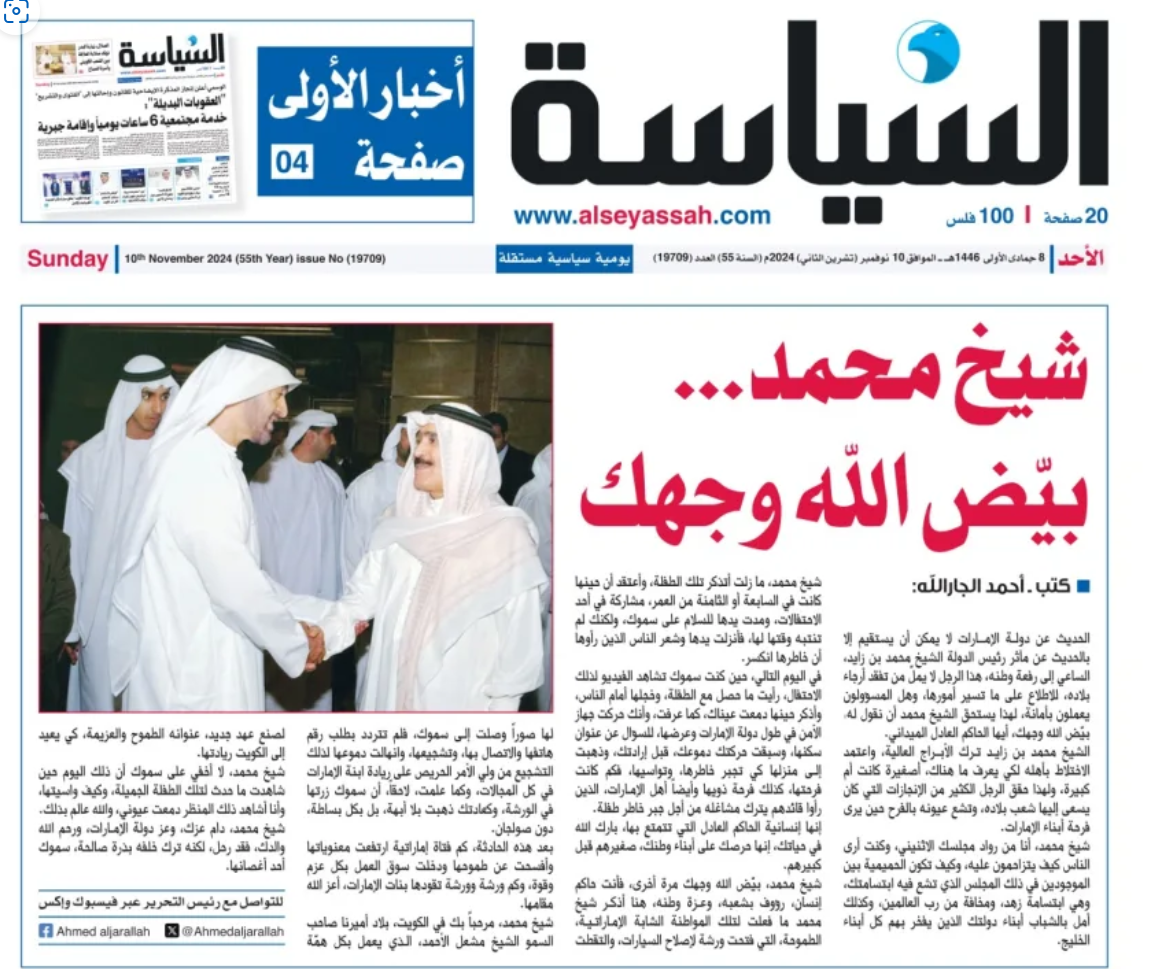 وعلى صدر صفحتها الأولى، نشرت صحيفة "السياسة" مقالاً لرئيس تحريرها، الكاتب أحمد الجارالله عُنون بـ "شيخ محمد... بيّض الله وجهك" أشاد فيه الكاتب بشخصية صاحب السمو، واصفاً سموه بـ "القائد الميداني الحريص على خدمة شعبه والنهوض ببلاده".