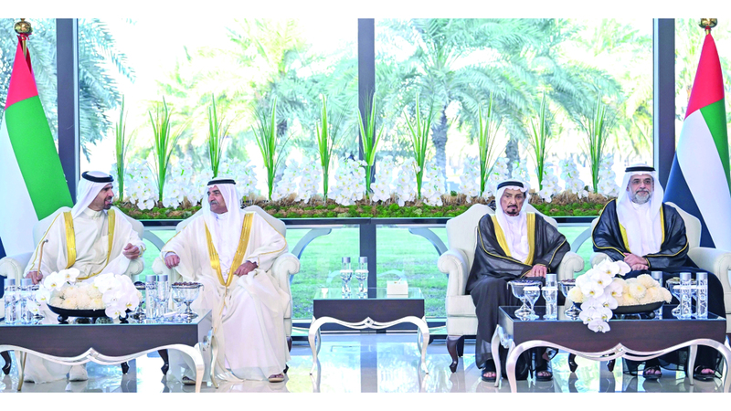 استقبل صاحب السموّ الشيخ حميد بن راشد النعيمي، عضو المجلس الأعلى حاكم عجمان، مساء أمس، صاحب السمو الشيخ حمد بن محمد الشرقي، عضو المجلس الأعلى حاكم الفجيرة، وصاحب السموّ الشيخ سعود بن راشد المعلا، عضو المجلس الأعلى حاكم أم القيوين، بمناسبة زفاف الشيخ عبدالله، نجل الشيخ أحمد بن حميد النعيمي، ممثل صاحب السمو حاكم عجمان للشؤون الإدارية والمالية، إلى كريمة عارف بن علي المهيري، وذلك في قصر الصفيا بعجمان.