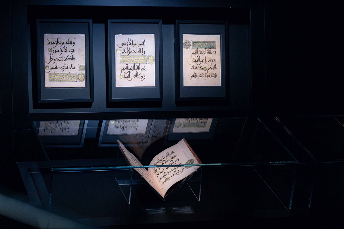 وتوقف سموه لدى نماذج متنوعة تتضمن صفحات من القرآن الكريم مكتوبة بالخط الحجازي والكوفي النادر من القرن السابع، وصفحات مُذهّبة من العصور الإسلامية المتأخرة، كالفترة العثمانية والفارسية والأندلسية.