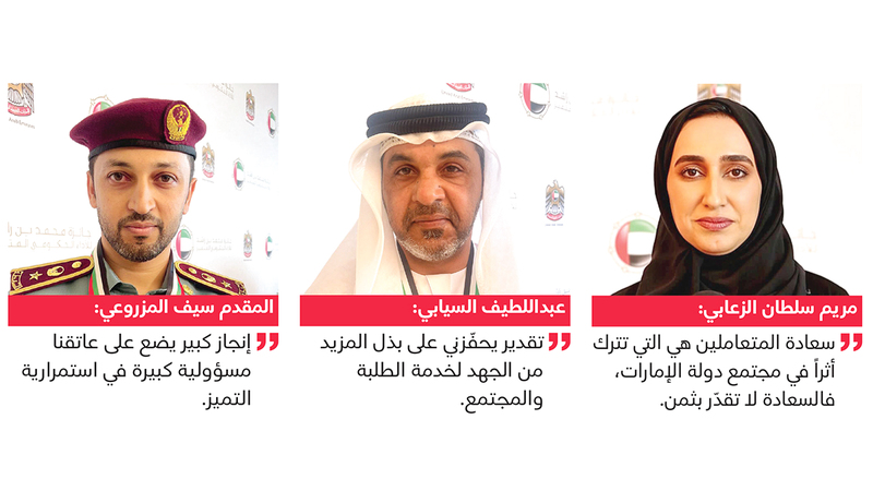 وقالت رئيسة قسم سعادة المتعاملين في وزارة الطاقة والبنية التحتية، مريم سلطان الزعابي، الحاصلة على وسام رئيس مجلس الوزراء في مجال سعادة المتعاملين: «أشعر بالاعتزاز والفخر والامتنان لفوزي بجائزة رئيس مجلس الوزراء في سعادة المتعاملين، لأن سعادة المتعاملين هي التي تترك أثراً في مجتمع دولة الإمارات، فالسعادة لا تقدر بثمن».