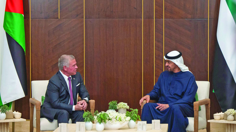 جاء ذلك خلال لقاء صاحب السمو رئيس الدولة أخاه جلالة الملك عبدالله الثاني بن الحسين، الذي وصل إلى العاصمة أبوظبي، أمس، في زيارة أخوية إلى دولة الإمارات، في إطار الحرص المتبادل على مواصلة التشاور الأخوي بشأن مختلف القضايا محل الاهتمام المشترك، خصوصاً في ظل الأوضاع التي تمرّ بها المنطقة.
