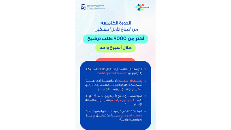 وتواصل الدورة الخامسة من مبادرة «صناع الأمل»، تلقي طلبات المشاركة والترشيح عبر موقعها الإلكتروني arabhopemakers.com، حيث يحق لأي شخص صاحب مبادرة إنسانية أو مجتمعية في أي مجال أو نشاط، التقدم للجائزة، كما يحق لأي مؤسسة أو جمعية أو مجموعة تطوعية أو مؤسسة ذات نشاط إنساني أو مجتمعي الترشح، ويحق للآخرين ترشيح من يرونه جديراً بذلك.