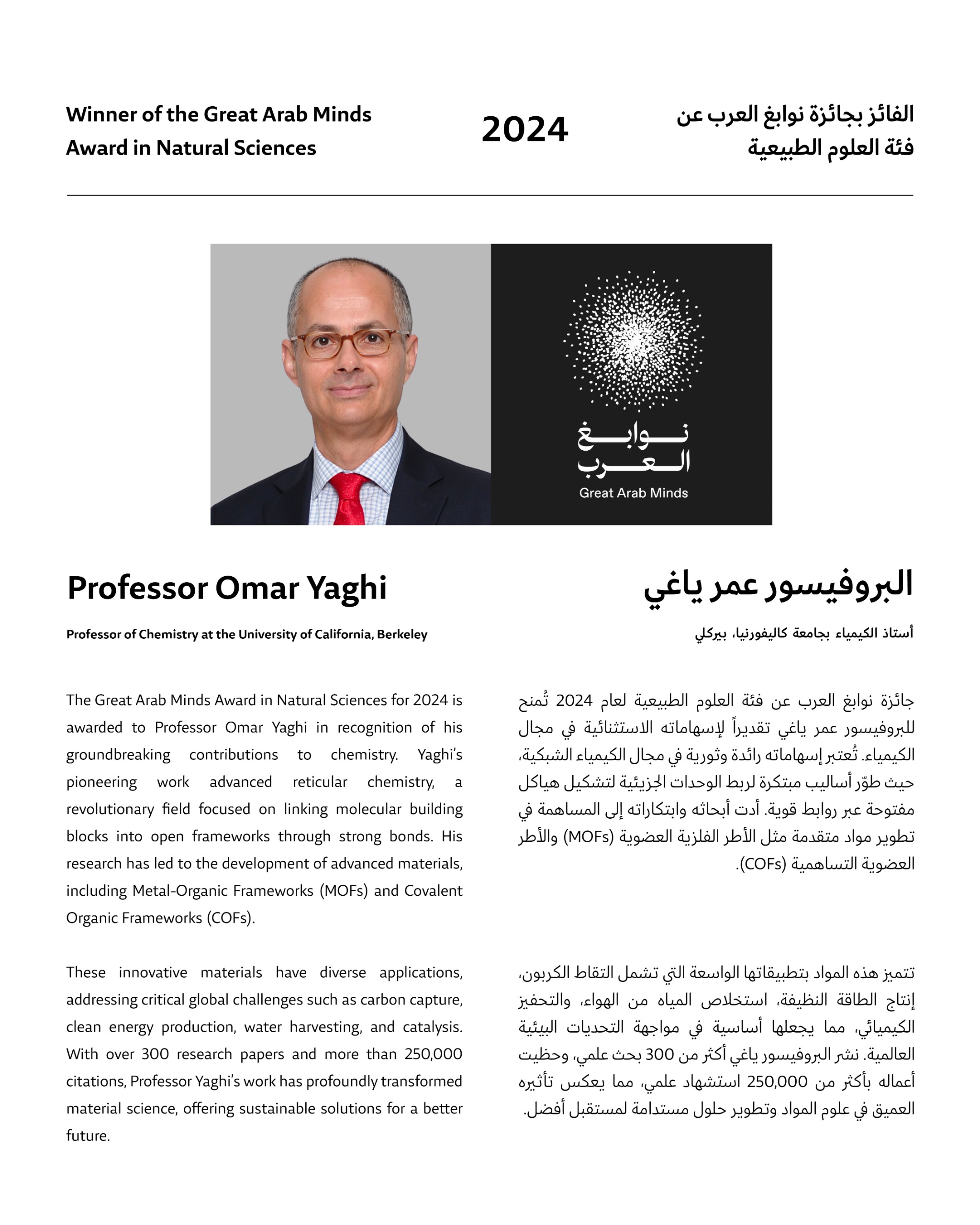 وقال صاحب السمو الشيخ محمد بن راشد آل مكتوم، في منشور على حساب سموه على منصة "‘إكس": "نبارك للفائز بجائزة نوابغ العرب عن فئة العلوم الطبيعية لعام 2024، البروفيسور عمر ياغي… من الأردن، قدّم البروفيسور عمر ياغي، أستاذ الكيمياء بجامعة كاليفورنيا، بيركلي، إسهامات استثنائية في مجال الكيمياء الشبكية. حيث أسهمت ابتكاراته في تطوير تطبيقات رائدة لمواجهة تحديات الطاقة، والمياه، والبيئة، ونشر أكثر من 300 بحث علمي، وحظيت أعماله بأكثر من 250,000 استشهاد علمي…".