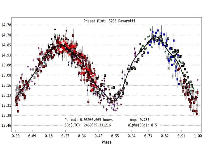ويعرض البحث نتائج أرصاد الكويكبات التي تمت من خلال 11 مرصدا عالميا، كان مرصد الختم الفلكي أحدها، ويبين المنحنى الضوئي لكل كويكب تم رصده مع توضيح المدة الدورانية لكل كويكب.