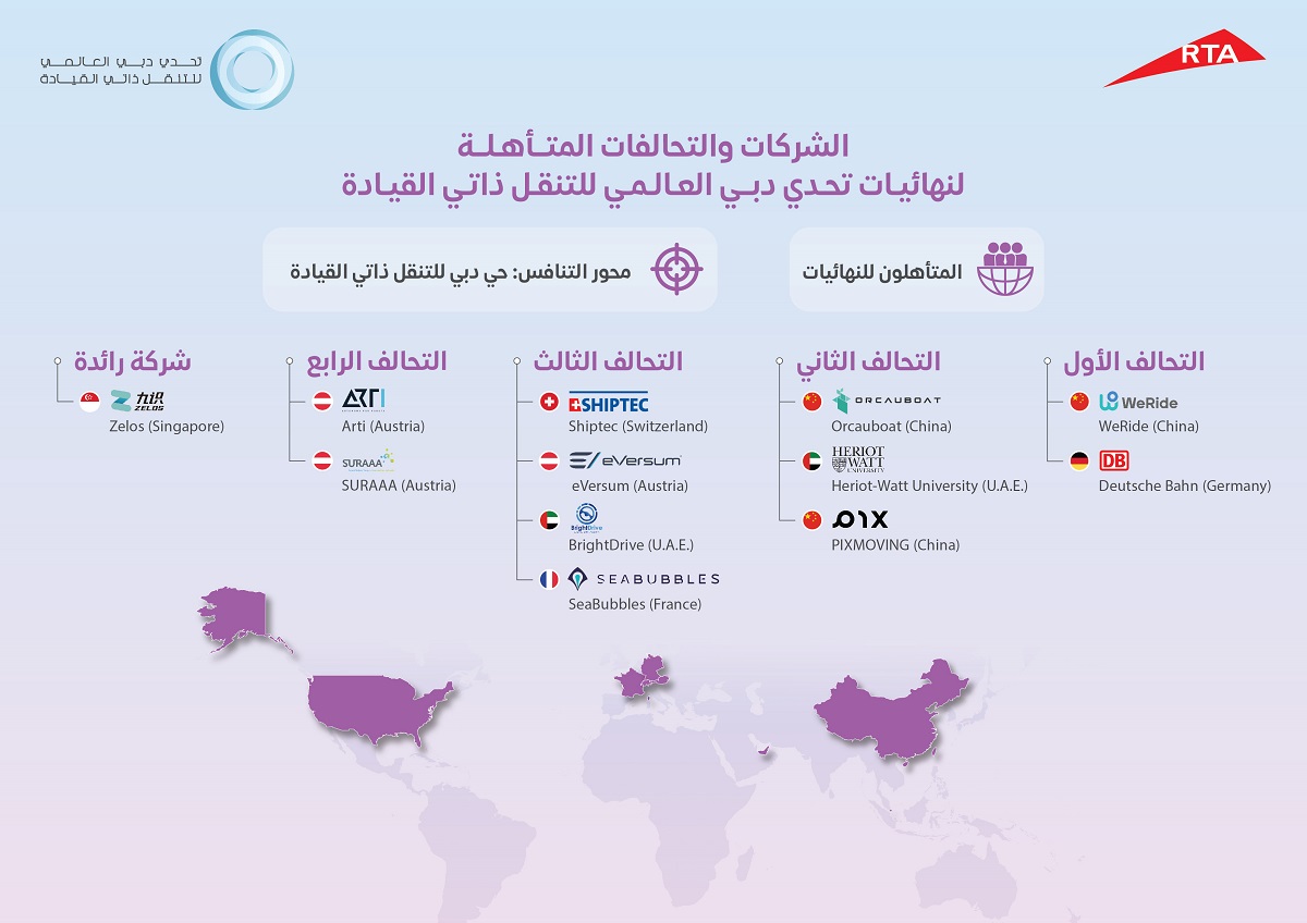 وبناء على قرار لجنة التحكيم العالمية برئاسة الدكتور ستيفن شلادوفير، الخبير الدولي في تقنيات التنقل ذاتي القيادة، رئيس لجنة تحكيم تحدي دبي العالمي للتنقل ذاتي القيادة، تأهلت خمسة تحالفات وشركات محلية وعالمية، للمنافسة على المرحلة النهائية، وهي: تحالف ((WeRide / Deutshe Bahn من دولة الإمارات العربية المتحدة وألمانيا والصين، وتحالف (BrightDrive / eVersum / Shiptec / SeaBubbles) من سويسرا، وفرنسا، والإمارات، والنمسا، وتحالف (Orcauboat / PIXMOVING / Heriot-Watt University Dubai) من الإمارات والصين وتحالف (SURAA / Arti) من النمسا، إضافة إلى الجهة المرشحة الخامسة وهي الشركة الرائدة (Zelos)، من سنغافورة.