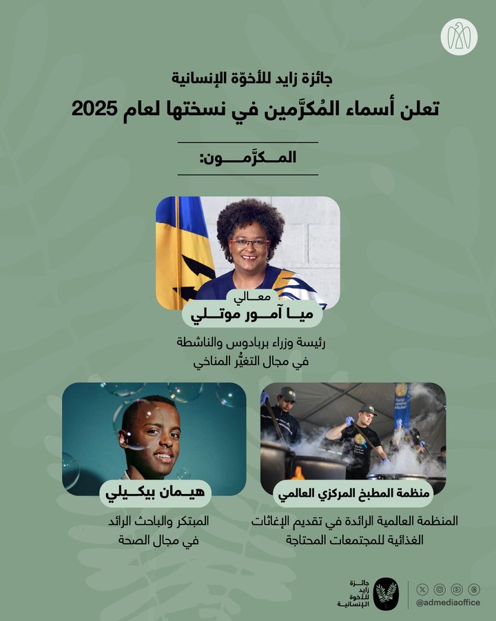 أعلنت جائزة زايد للأخوّة الإنسانية عن أسماء المكرَّمين بالنسخة السادسة لعام 2025، وهم ميا آمور موتلي، رئيسة وزراء باربادوس مستشار أول وعضو برلمان والناشطة في مجال مكافحة التغيُّر المناخي، و«منظمة المطبخ المركزي العالمي» التي أسَّسها الشيف خوسيه أندريس، والمبتكِر والباحث العلمي في مجال الصحة هيمان بيكيلي، البالغ من العمر 15 عاماً، والذي يُعَدُّ أول شاب يحصل على هذه الجائزة.