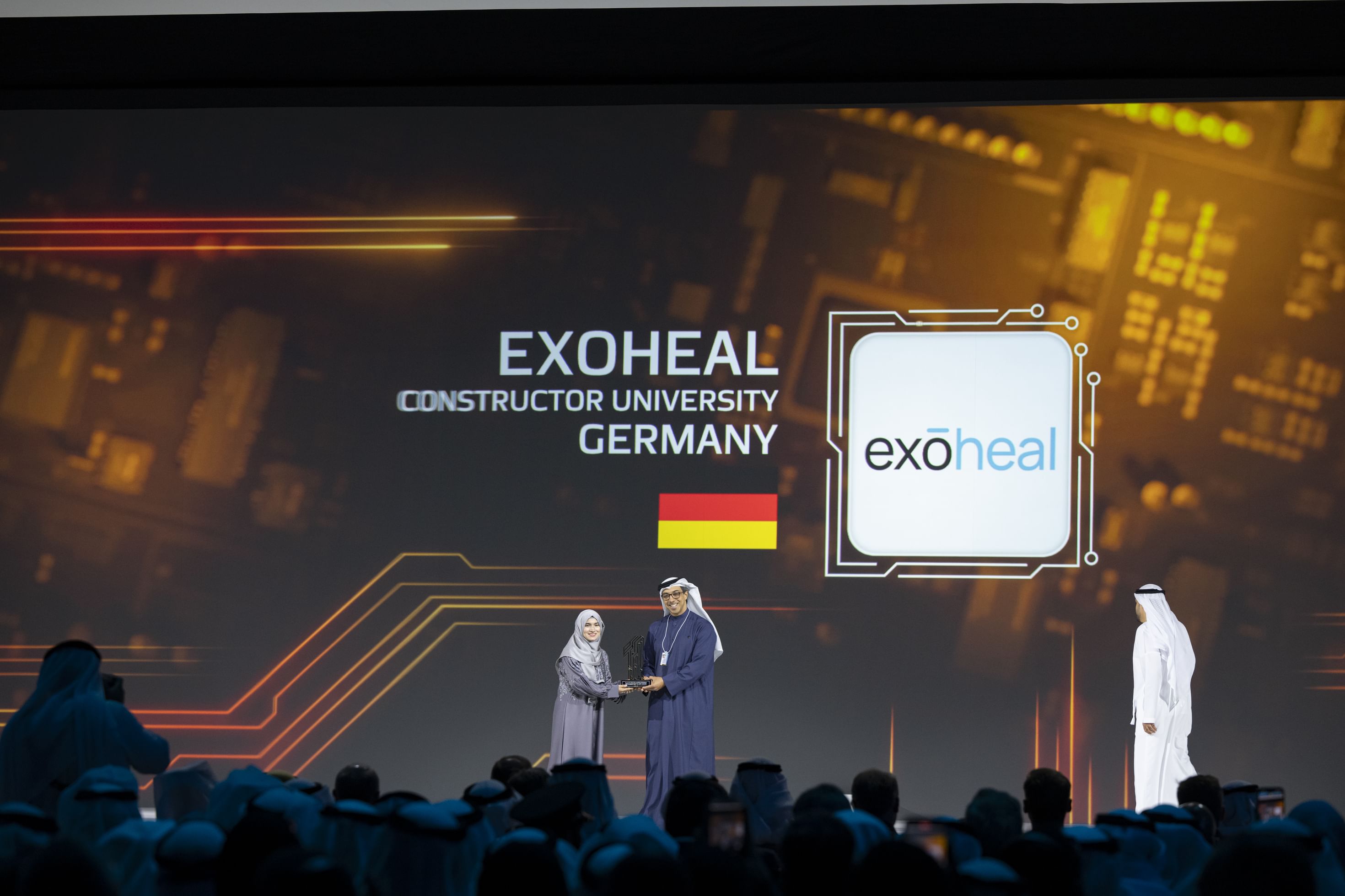 وكرّم سموّه فريق تطبيق "إكسو هيل" من جامعة "كونستركتر" في ألمانيا الذي فاز بالمركز الأول في الجائزة العالمية لأفضل التطبيقات الحكومية، ويقدّم المشروع حلاً مبتكراً لإعادة تأهيل مرضى السكتة الدماغية والمصابين بالشلل، من خلال تطبيق ذكي وقفاز روبوتي يعمل بالذكاء الاصطناعي، يسرّع العلاج بنسبة 50%، ويعتمد على التعلم الآلي لتخصيص خطط العلاج لكل مريض، مع تضمين أنشطة علاجية تفاعلية تحفّز المرضى. كما يتيح للأطباء متابعة تقدم حالة المرضى عن بُعد وتعديل العلاجات وفق الحاجة، ما يجعله أداة ثورية في إعادة التأهيل العصبي.