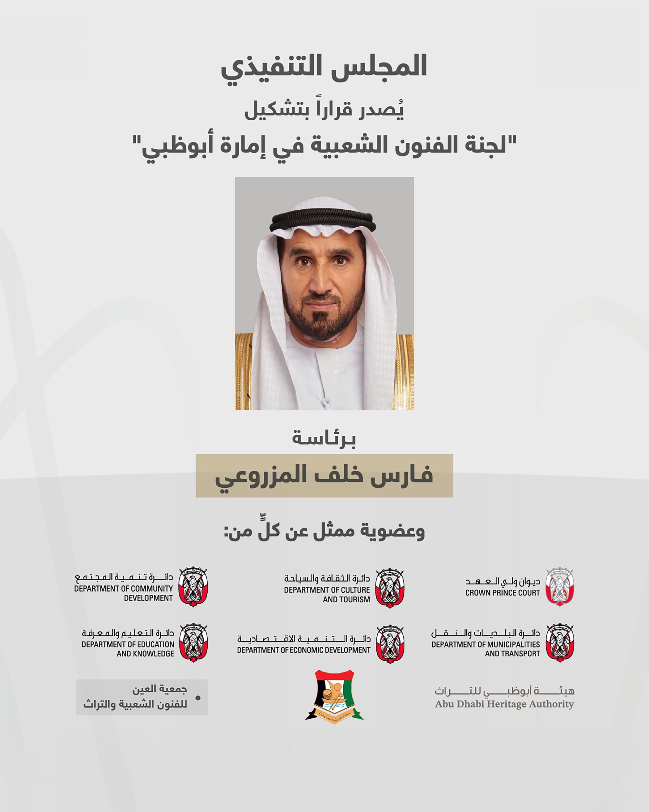 أصدر المجلس التنفيذي لإمارة أبوظبي، قراراً بتشكيل "لجنة الفنون الشعبية في إمارة أبوظبي" برئاسة معالي فارس خلف المزروعي، رئيس هيئة أبوظبي للتراث.