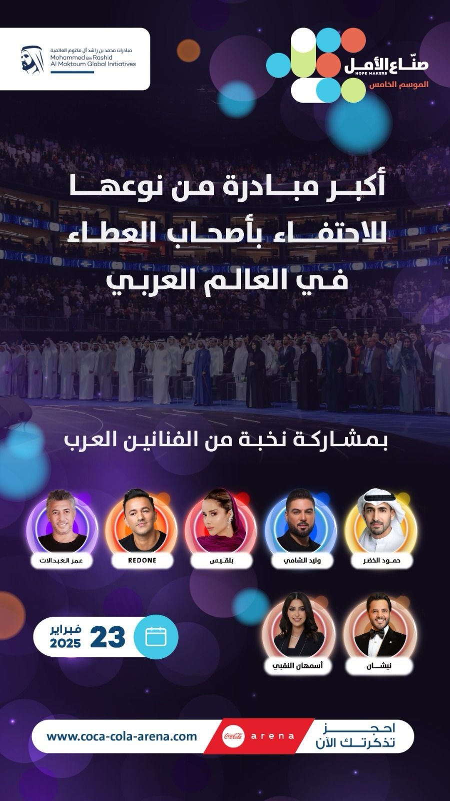 وأعلنت "صناع الأمل"، المبادرة الأكبر من نوعها عربياً لتكريم أصحاب البذل والعطاء عن طرح تذاكر الحفل الختامي لنسختها الخامسة، ويقدمه الإعلاميان نيشان ديرهاروتيونيان وأسمهان النقبي، عبر الموقع الإلكتروني: www.coca-cola-arena.com.