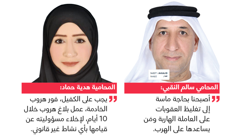 فيما أكّدت المحامية، هدية حماد، أنه يجب على صاحب العمل فور هروب العاملة عمل بلاغ هروب خلال 10 أيام من تاريخ الهروب حتى يُخلي مسؤوليته من قيامها بأي نشاط غير قانوني، مشيرة إلى أنه بعد قيام صاحب العمل بتقديم بلاغ الهروب لا تكون هناك أي مسؤولية قانونية عليه، ولا يتحمل تذكرة الطيران في حالة انتقال العاملة إلى شخص آخر.
