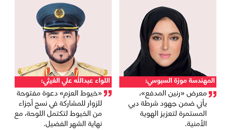 وأكد مساعد القائد العام لشؤون العمليات في شرطة دبي، اللواء عبدالله علي الغيثي، لـ«الإمارات اليوم»، أن ما يميز لوحة «خيوط العزم» أنها تقدم دعوة مفتوحة لزوار ساحة الوصل في مدينة إكسبو دبي للمشاركة في نسج أجزاء من الخيوط المتداخلة في اللوحة، لتكتمل الصورة مع نهاية شهر رمضان الفضيل، لافتاً إلى أن اللوحة تترجم مفهوم الاستدامة وتلاحم أفراد المجتمع، ما يمثل شعار عام المجتمع.. «يداً بيد».