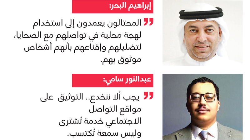 وأشار البحر إلى أن المحتالين يعمدون إلى استخدام لهجة محلية في تواصلهم مع الضحايا، لتضليلهم وإقناعهم بأنهم أشخاص موثوق بهم، ويتبعون لمزارع داخل الدولة، مؤكداً أن تحويل المبالغ يتم إلى حسابات محلية، ما يُضفي على العملية طابعاً رسمياً، ويصعّب الشك فيها.