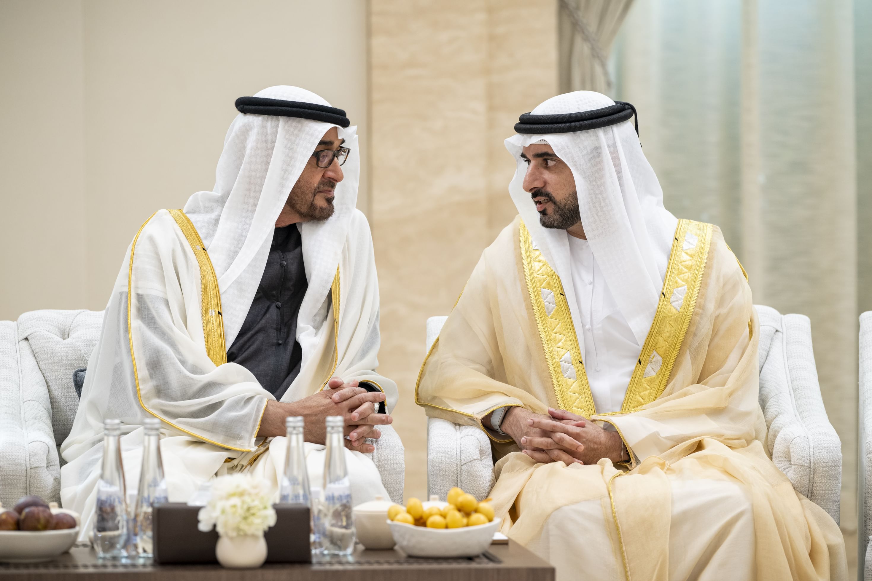 ومن جانبهما، عبر العريسان عن شكرهما لصاحب السمو الشيخ محمد بن زايد آل نهيان واعتزازهما بحضور سموه حفل زفافهما.