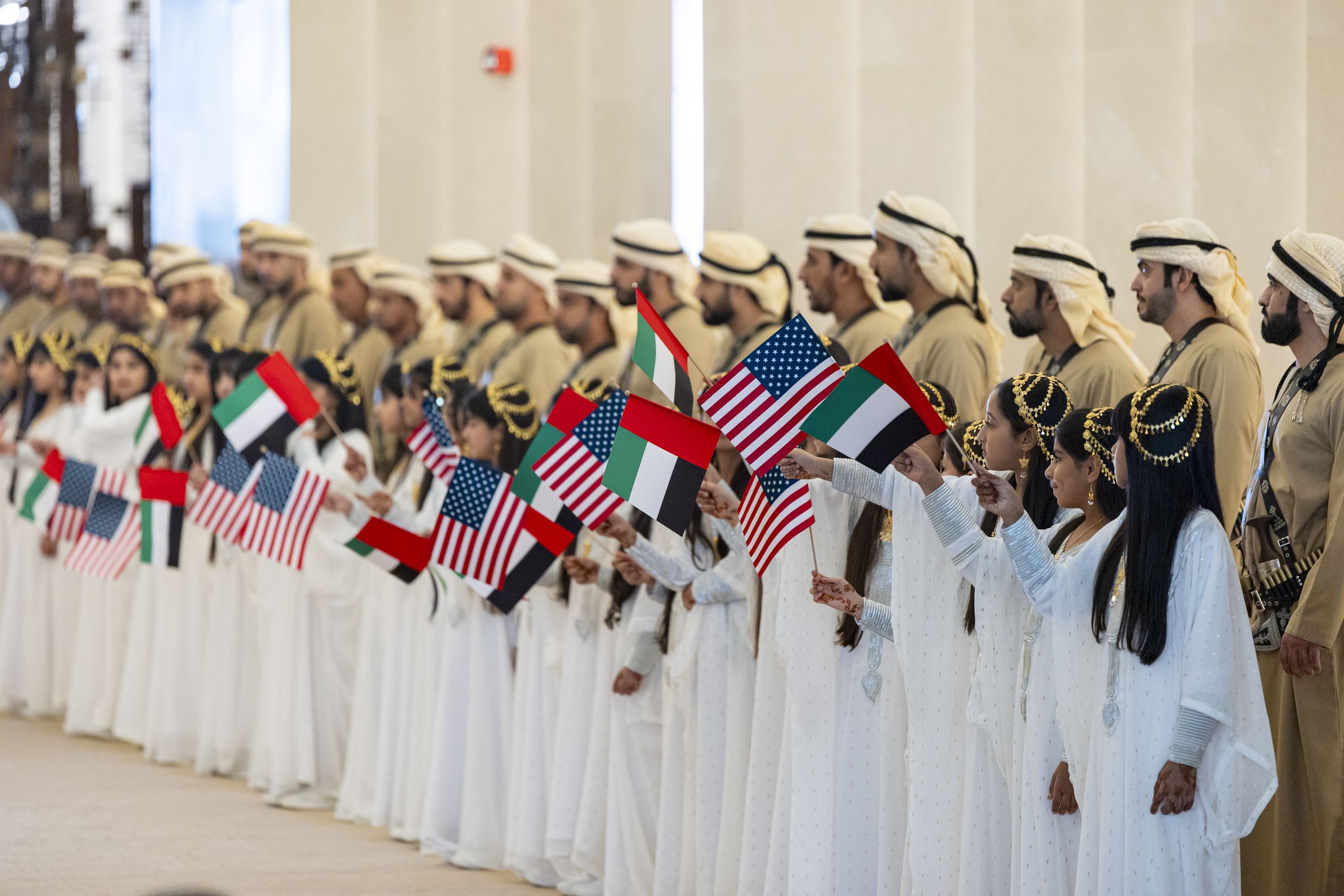 وقد كان في الاستقبال..سمو الشيخ منصور بن زايد آل نهيان نائب رئيس الدولة نائب رئيس مجلس الوزراء رئيس ديوان الرئاسة وسمو الشيخ خالد بن محمد بن زايد آل نهيان ولي عهد أبوظبي وسمو الشيخ حمدان بن محمد بن راشد آل مكتوم ولي عهد دبي نائب رئيس مجلس الوزراء وزير الدفاع وسمو الشيخ طحنون بن زايد آل نهيان نائب حاكم إمارة أبوظبي مستشار الأمن الوطني وسمو الشيخ حامد بن زايد آل نهيان وسمو الشيخ عبد الله بن زايد آل نهيان نائب رئيس مجلس الوزراء وزير الخارجية وسمو الشيخ حمدان بن محمد بن زايد آل نهيان نائب رئيس ديوان الرئاسة للشؤون الخاصة ومعالي الشيخ محمد بن حمد بن طحنون آل نهيان مستشار رئيس الدولة بجانب عدد من الوزراء وكبار المسؤولين في الدولة..فيما يرافق الرئيس الأميركي وفد يضم عدداً من الوزراء وكبار المسؤولين.