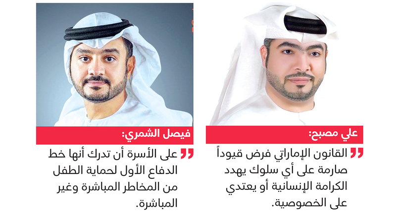 وأضاف أن قانون دولة الإمارات كان سبّاقاً في تنظيم المحتوى الرقمي، إذ فرض قيوداً صارمة على أي سلوك يهدد الكرامة الإنسانية أو يعتدي على الخصوصية، حتى لو كان تحت غطاء «الرأي» أو «الحرية الشخصية»، ومن ذلك المرسوم بقانون اتحادي بشأن مكافحة الشائعات والجرائم الإلكترونية إذ نصّ على أنه يُعاقب بالحبس والغرامة التي لا تقل عن 95 ألف درهم ولا تزيد على 500 ألف درهم، كل من استخدم شبكة معلوماتية أو وسيلة تقنية معلومات في الاعتداء على خصوصية شخص، وتشمل هذه المادة: نشر صور أو تسجيلات، أو معلومات تتعلق بالحياة الخاصة، دون رضا الطرف المعني، حتى لو كان من أحد أفراد الأسرة، كما نصّ قانون حقوق الطفل (وديمة)، على حظر تعريض الطفل لأي نوع من أنواع الإيذاء أو الإهمال أو الاستغلال، سواء أكان جسدياً أو نفسياً أو عاطفياً أو عبر وسائل الإعلام المختلفة، وعدّ تصوير الطفل أو ذكر اسمه في سياق نزاع عائلي أو فضح أحد والديه اعتداءً على حقه في الخصوصية والكرامة.