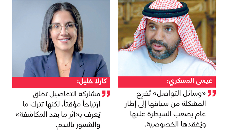 وحذّرت من أن مشاركة التفاصيل الحساسة قد تخلق ارتياحاً مؤقتاً، لكنها تترك ما يُعرف بـ«أثر ما بعد المكاشفة» وشعور متأخر بالندم، والخجل، وأحياناً الاكتئاب، كما يتعرض البعض أيضاً للتنمر، أو الابتزاز الإلكتروني.