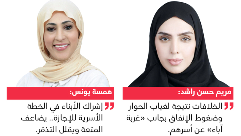 وقالت: «تزداد الخلافات جداً خلال الإجازات نتيجة تغيير الروتين، وكثرة التفاعل اليومي»، لافتة إلى أن أبرز أسبابها غياب الحوار، وتضارب التوقعات حول الأنشطة، وأحياناً ضغوط الإنفاق.