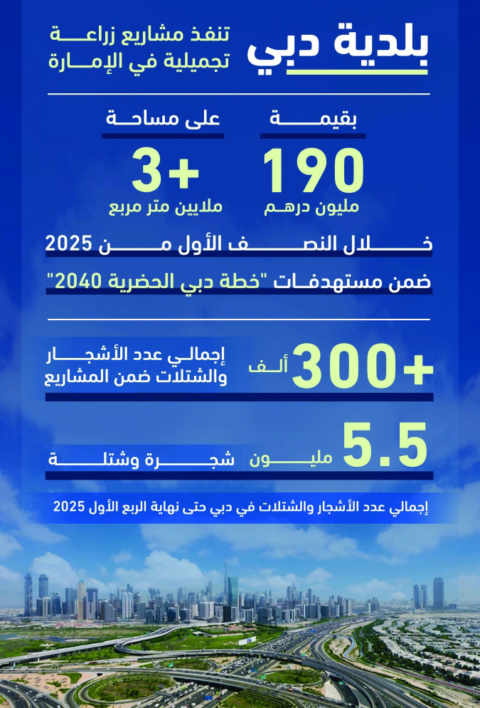 أعلنت بلدية دبي إنجاز مشروعات الزراعة التجميلية والتشجير في عدد من التقاطعات والشوارع الرئيسة بالإمارة، بكُلفة 190 مليون درهم، وعلى مساحة تمتد لأكثر من ثلاثة ملايين متر مربع، خلال النصف الأول من العام الجاري، وذلك ضمن خططها الاستراتيجية لتجميل وتخضير المدينة، والارتقاء بالإطلالة الحضارية للإمارة، باتباع أفضل الممارسات الزراعية المستدامة، بما يدعم أهداف مشروعها «دبي الخضراء»، الرامي إلى زيادة مساحات التخضير والتجميل الزراعي في المدينة، ورفع نصيب الفرد من المساحات الخضراء، وتوفير بيئة صحية تعزز جودة الحياة وفق خطط حضرية مستدامة، تتكامل مع مستهدفات «خطة دبي الحضرية 2040».