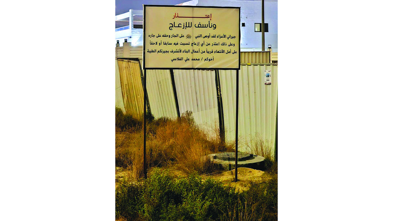 وثق مستخدمو منصات التواصل الاجتماعي صورة لافتة علقها المواطن محمد علي الفلاسي على سور منزله قيد الإنشاء في منطقة ند الشبا-4 بإمارة دبي، يعتذر فيها لجيرانه عن أي إزعاج قد تسببه أعمال البناء لهم، وعبر عن أمله في انتهاء الأعمال قريباً.