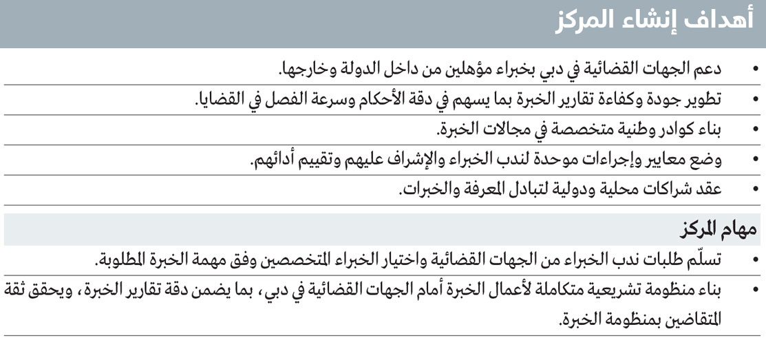 كما سيتولى المركز بناء منظومة تشريعية متكاملة لأعمال الخبرة أمام الجهات القضائية في الإمارة، بما يضمن دقة تقارير الخبرة، ويحقق ثقة المتقاضين بمنظومة الخبرة.