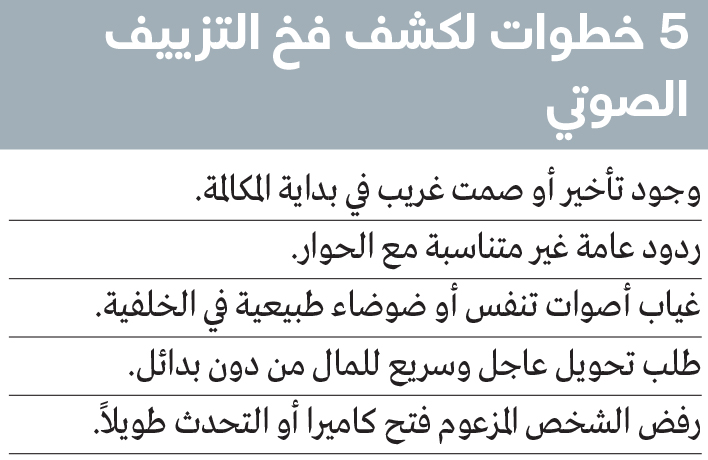 ولفت إلى وجود مؤشرات يجب الانتباه إليها في حال تلقي رسالة صوتية غير مألوفة من أحد الأقارب أو الأصدقاء طلباً للمال، منها وجود أحد هذه الأمور: خلل حتى لو كان بسيطاً في السياق مثل التأخير أو الصمت في بداية الرسالة أو المكالمة، بطء أو تلعثم في الحديث، اختلاف في نطق بعض الكلمات أو الحروف، تغيّر غير متسق في النغمة أو الإيقاع.