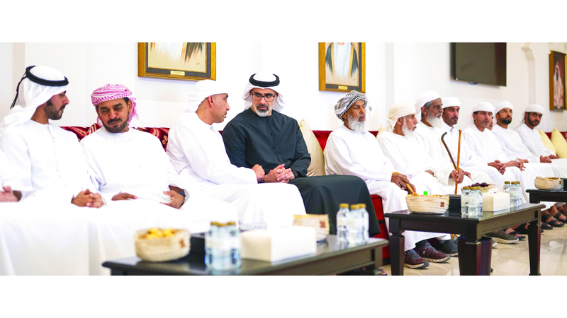 خالد بن محمد خلال تقديمه واجب العزاء بمجلس أم غافة في منطقة العين. وام
