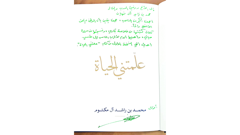 وكتب صاحب السمو الشيخ محمد بن راشد آل مكتوم، على نسخة الإهداء الأولى الخاصة بصاحب السمو الشيخ محمد بن زايد آل نهيان: «إلى الأخ ورفيق الدرب والقائد محمد بن زايد آل نهيان، ما جمعنا أكبر من المناصب، جمعنا يقين بأن الوطن يستحق الأفضل دائماً.. كلمات كتبتها من خلاصة تجاربي، ونسجتها من سيرة حياتي، وأهديها اليوم لأقرب الناس إلى نفسي.. أهديك أخي النسخة الأولى من كتاب (علمتني الحياة)».