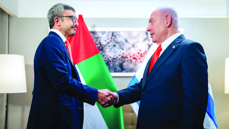 عبدالله بن زايد خلال لقائه رئيس الوزراء الإسرائيلي. وام