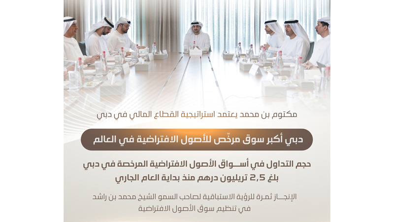 أكّد صاحب السموّ الشيخ محمد بن راشد آل مكتوم، نائب رئيس الدولة رئيس مجلس الوزراء حاكم دبي، رعاه الله، أن سلطة دبي للأصول الافتراضية التي تأسست بقرار من سموّه قبل ثلاث سنوات، بإشراف سموّ الشيخ مكتوم بن محمد بن راشد آل مكتوم، النائب الأول لحاكم دبي نائب رئيس مجلس الوزراء وزير المالية رئيس اللجنة العليا لتطوير القطاع الاقتصادي والمالي في دبي، صعدت بالإمارة - خلال هذه الفترة القصيرة - إلى الصدارة، كأكبر سوق مرخص للأصول الافتراضية حول العالم، بتداولات تتجاوز 2.5 تريليون درهم منذ بداية العام.