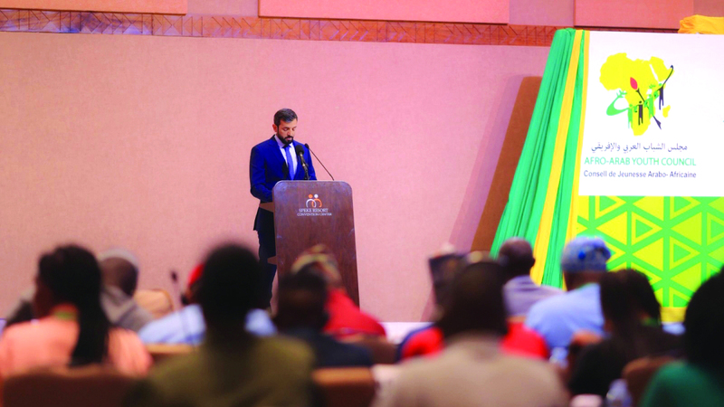 النيادي خلال مشاركته في أعمال مؤتمر «مجلس الشباب العربي والإفريقي». وام