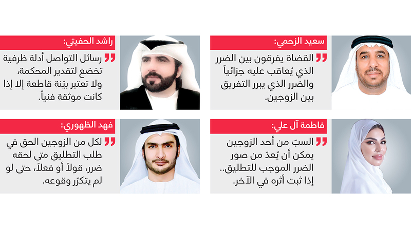 ويرى قانونيون أن مجرد تبادل الألفاظ الجارحة أو العبارات الغاضبة عبر تطبيقات مثل «واتس أب» و«إنستغرام» لا يُعد دليلاً كافياً لإثبات الضرر الموجب للطلاق، ما لم تدعم الشكوى بأدلة قانونية معترف بها، مؤكدين أن المشرع الإماراتي يفرق بين الجريمة الإلكترونية والضرر الأسري، «لأن الانفعالات اللحظية أو الكلمات الغاضبة لا تُبنى عليها أحكام الطلاق»، و«لأن العشرة الزوجية لا تفكك برسالة إلكترونية غاضبة».