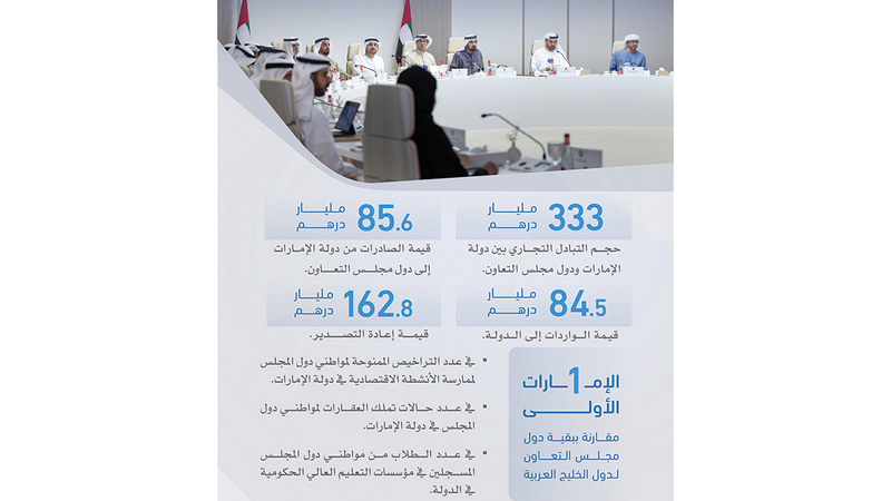 استعرض مجلس الوزراء، خلال اجتماعه، مستجدات سير العمل في مجالات العمل الاقتصادي الخليجي المشترك لعام 2024، حيث بلغ إجمالي حجم التبادل التجاري بين دولة الإمارات ودول مجلس التعاون نحو 333 مليار درهم، ووصلت قيمة الصادرات من الدولة إلى دول مجلس التعاون إلى نحو 85.6 مليار درهم، ووصلت قيمة الواردات إلى الدولة نحو 84.5 مليار درهم، كما بلغ إجمالي إعادة التصدير في عام 2024 نحو 162.8 مليار درهم.