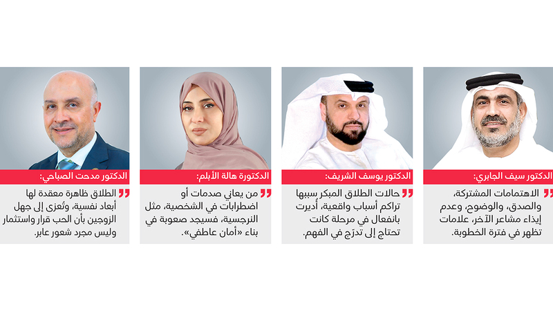 ووصف استشاري الطب النفسي، الدكتور مدحت الصباحي، «الطلاق المبكر» بأنه «من الظواهر المعقدة التي لها أبعاد نفسية مختلفة. وتبدأ عادة نتيجة انهيار الأحلام الوردية التي يضعها المتزوجون أمام واقع المسؤوليات المشتركة بعد الزواج»، مشيراً إلى أن الطلاق المبكر لا يعني عدم التوافق، ولكن أحياناً يكون سببه غياب الثقافة الزوجية وجهل الزوجين بأن الحب هو قرار واستثمار، وليس مجرد شعور عابر.