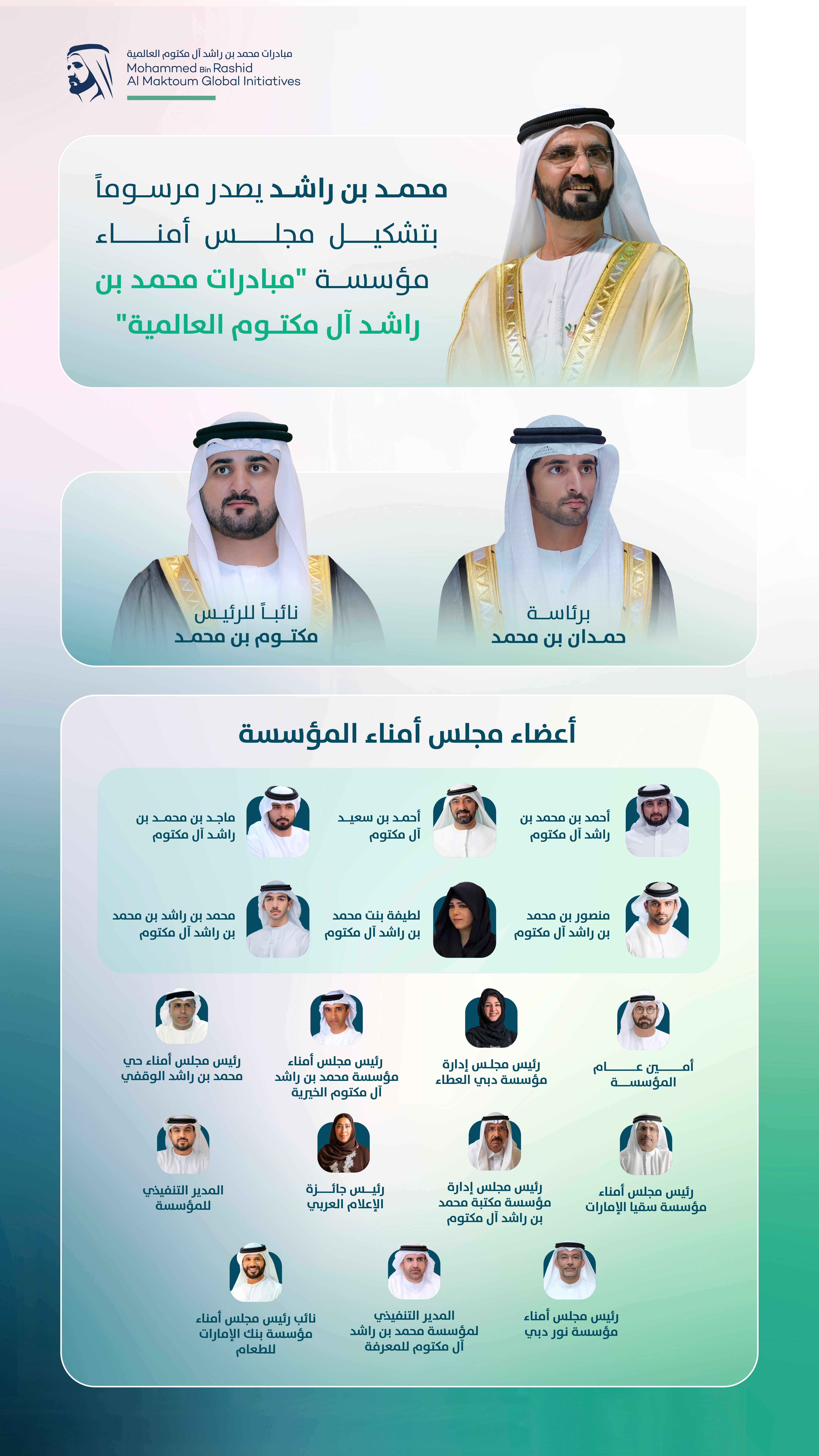 كما أصدر صاحب السمو الشيخ محمد بن راشد آل مكتوم المرسوم رقم 43 لسنة 2025 بتشكيل مجلس أمناء مؤسسة «مبادرات محمد بن راشد آل مكتوم العالمية»، الذي نص على أن يُشكّل مجلس أمناء المؤسسة برئاسة سمو الشيخ حمدان بن محمد بن راشد آل مكتوم، وعضوية سمو الشيخ مكتوم بن محمد بن راشد آل مكتوم، نائباً للرئيس.