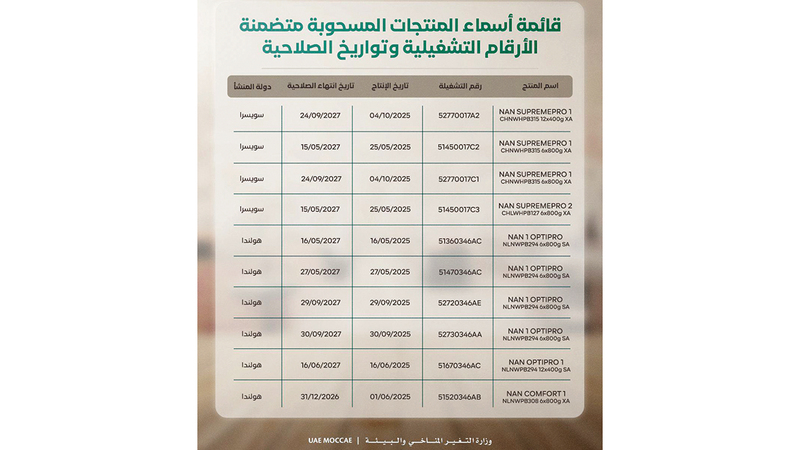 وكانت مؤسسة الإمارات للدواء أعلنت سحباً طوعياً واحترازياً لعدد محدود من منتجات حليب الأطفال «نان كومفورت 1»، و«نان أوبتيبرو 1»، و«نان سوبريم برو 1 و2 و3» و«إس 26 التيما 1 و2 و3» و«الفامينو»، حيث يحتوي أحد مدخلات الإنتاج على آثار من بكتيريا Bacillus cereus التي يمكن أن تنتج مادة cereulide، وذلك حرصاً على صحة وسلامة المستهلكين.