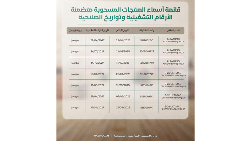 وتضمنت القائمة 24 رقماً تشغيلياً للمنتجات المسحوبة ورقم التشغيلة وتاريخ الإنتاج والصلاحية ودولة المنشأ.