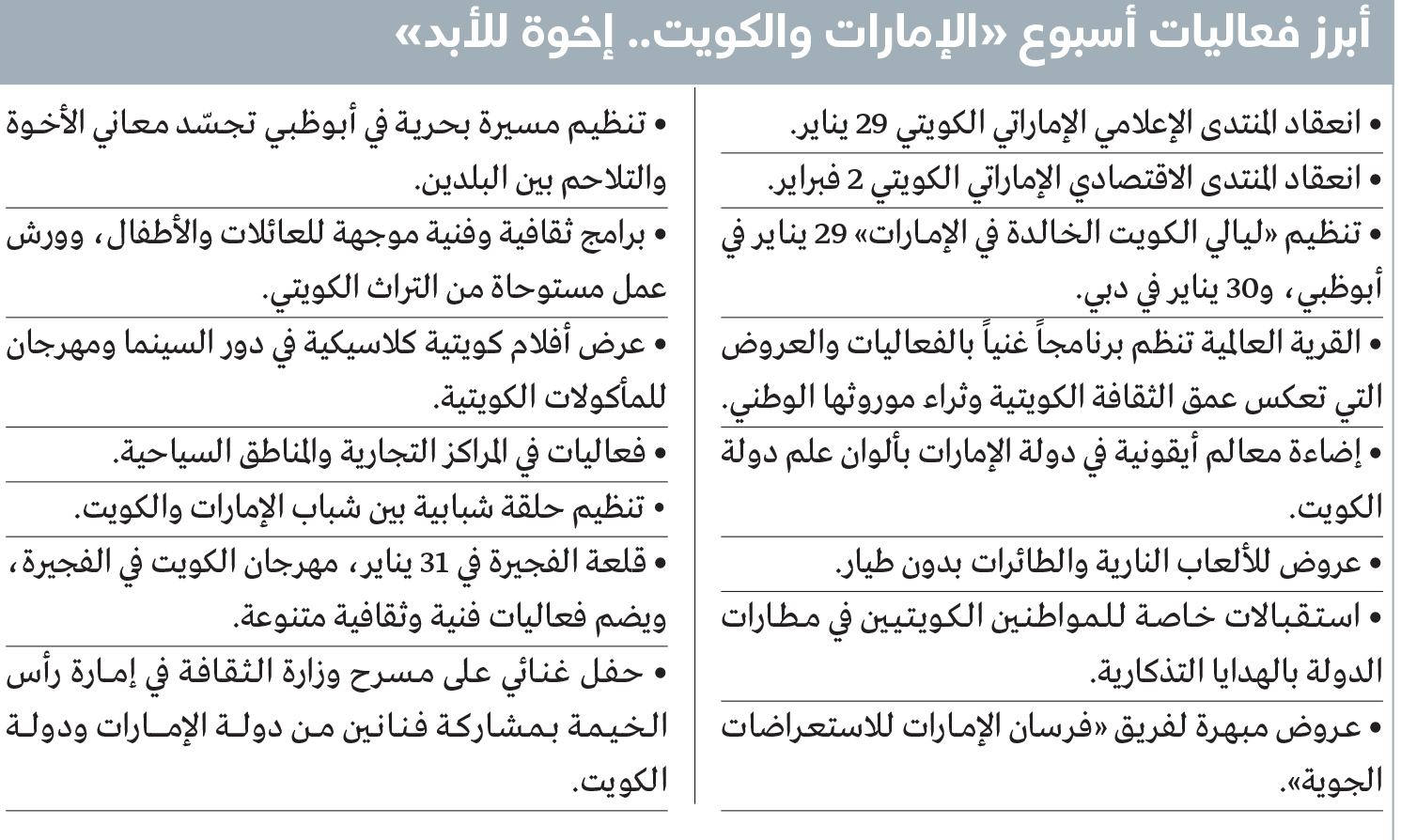 ويشهد أسبوع «الإمارات والكويت إخوة للأبد» في إمارة دبي، تنظيم فعالية «ليالي الكويت الخالدة في الإمارات» يوم 30 يناير الجاري في برج بارك - البوليفارد بدبي، وتتضمن حفلاً غنائياً وفنياً بمشاركة نخبة من نجوم الغناء في دولة الإمارات ودولة الكويت، وهم: حسين الجسمي، ومطرف المطرف، وبلقيس، وخالد المظفر. كما سيتم تنظيم الفعالية الثقافية الفنية «الكويت في دارها» في جميرا كايت بيتش والتي تستمر من 29 يناير حتى 4 فبراير، وتتضمن مساحة مفتوحة بإطلالة بحرية تجمع الموسيقى والعروض الحية والمأكولات في تجربة معاصرة تبرز الثقافة الإماراتية والكويتية.