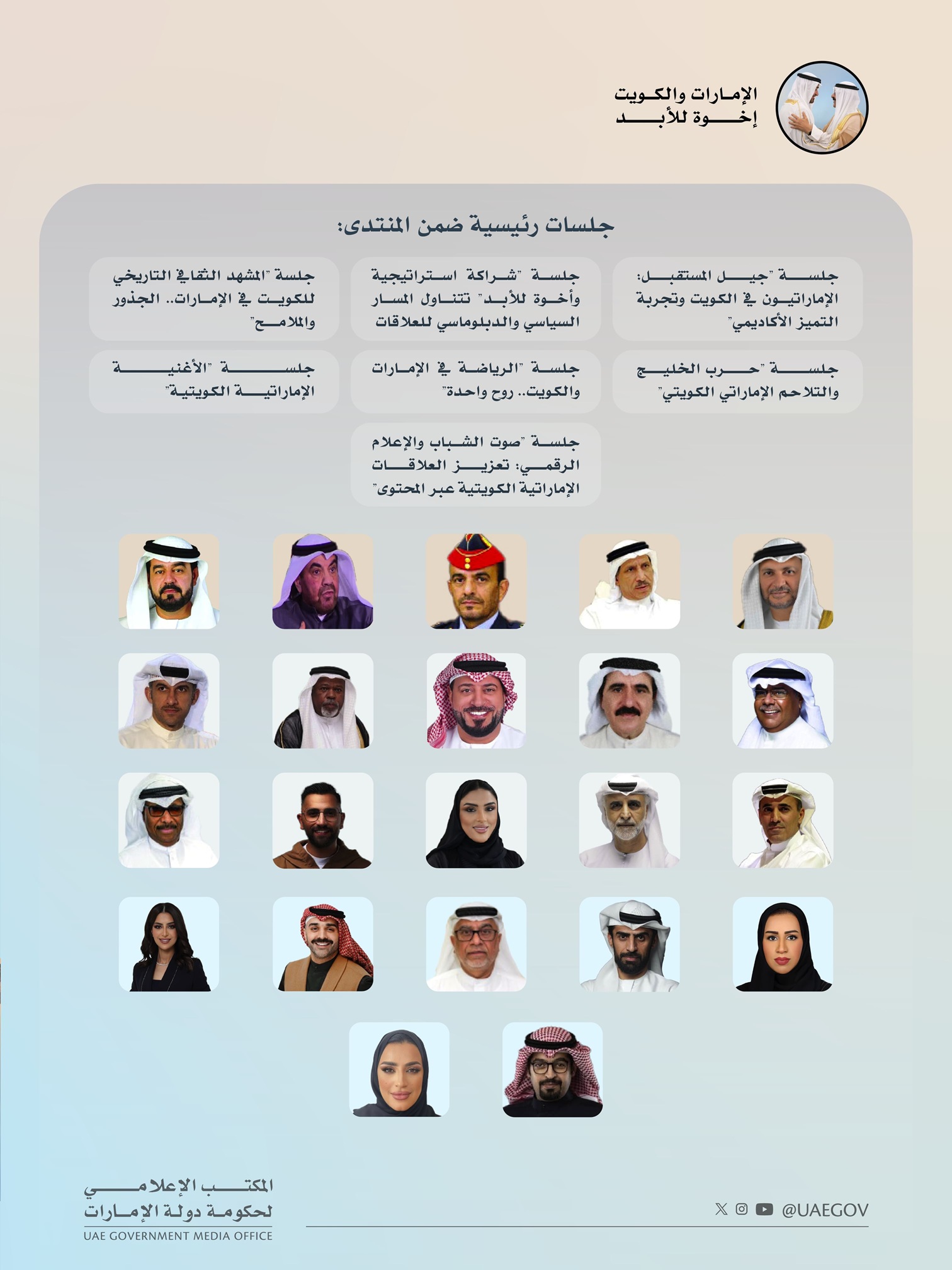تنفيذاً لتوجيهات القيادة الرشيدة بالاحتفاء بالعلاقات الأخوية الراسخة بين دولة الإمارات العربية المتحدة ودولة الكويت الشقيقة، ينطلق يوم الخميس المقبل "المنتدى الإعلامي الإماراتي الكويتي" ضمن فعاليات أسبوع "الإمارات والكويت.. إخوة للأبد" الذي يبدأ يوم 29 يناير الجاري ولمدة أسبوع في جميع إمارات الدولة.