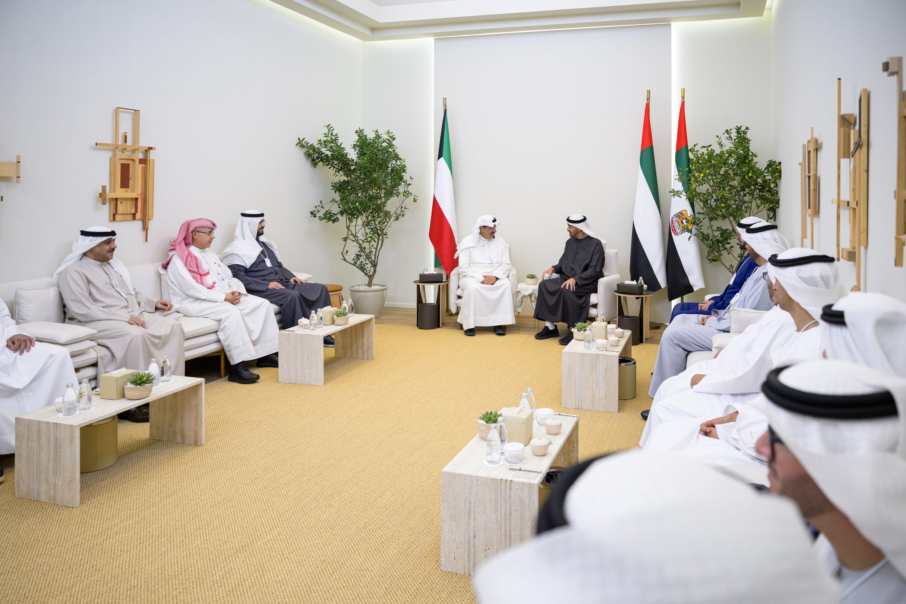 ونقل سمو رئيس الوزراء الكويتي إلى صاحب السمو رئيس الدولة تحيات أخيه صاحب السمو الشيخ مشعل الأحمد الجابر الصباح، أمير دولة الكويت الشقيقة وتمنياته للإمارات وشعبها دوام التنمية والازدهار.. فيما رحب سموه به في بلده الثاني وحمّله عميق تحياته إلى صاحب السمو الشيخ مشعل الأحمد الجابر الصباح وتهانيه بمناسبة احتفاء الكويت بأيامها الوطنية، وتمنياته له بموفور الصحة والعافية وللكويت وشعبها دوام التقدم والنماء.