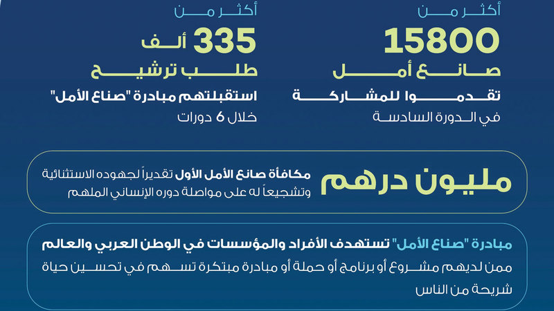 واستقبلت الدورة السادسة من مبادرة «صنّاع الأمل» التي تنضوي تحت مظلة مؤسسة «مبادرات محمد بن راشد آل مكتوم العالمية»، 15 ألفاً و802 ترشيح، ليصل إجمالي عدد صنّاع الأمل الذين شاركوا في المبادرة منذ إطلاقها في عام 2017 إلى أكثر من 335 ألف صانع أمل.