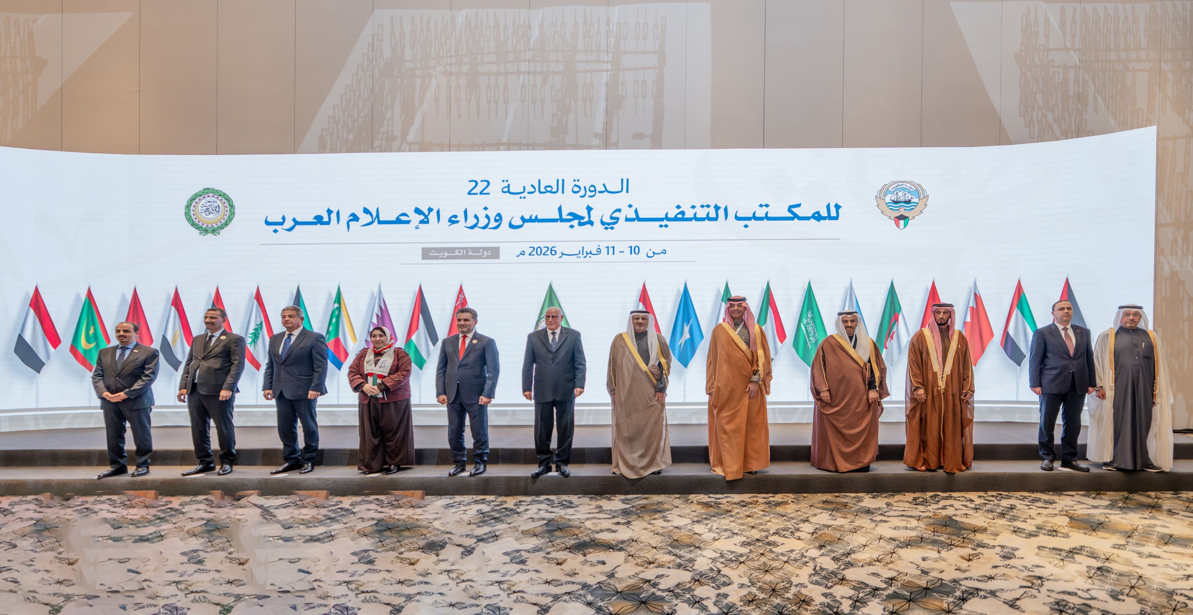 وتقدم بالشكر إلى دولة الكويت الشقيقة على استضافتها أعمال الدورة الـ104 للجنة الدائمة للإعلام العربي، والدورة العادية الـ22 للمكتب التنفيذي لمجلس وزراء الإعلام العرب، مثمناً دورها الريادي في دعم منظومة العمل العربي المشترك وتطوير أدوات الخطاب الإعلامي.