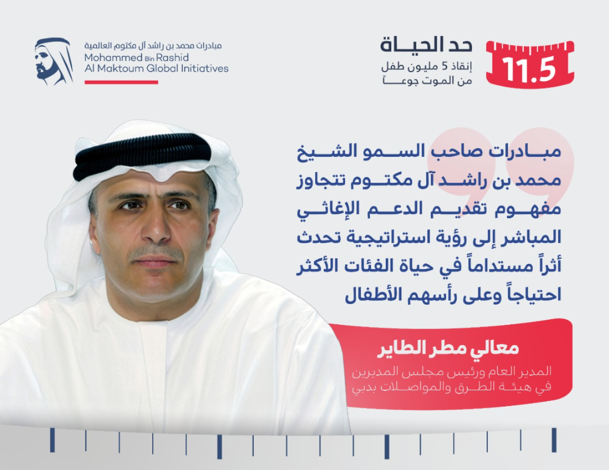 أكد مطر الطاير المدير العام ورئيس مجلس المديرين في هيئة الطرق والمواصلات بدبي، أن مبادرة صاحب السمو الشيخ محمد بن راشد آل مكتوم، نائب رئيس الدولة رئيس مجلس الوزراء حاكم دبي "رعاه الله"، بإطلاق حملة "حد الحياة"، التي تستهدف إنقاذ خمسة ملايين طفل حول العالم من خطر سوء التغذية والجوع، تمثل امتداداً لنهج إنساني راسخ جعل من دولة الإمارات نموذجاً عالمياً في العمل الخيري المؤسسي المستدام، مشيراً إلى أن مشاركة الهيئة في هذه الحملة تنطلق من مسؤوليتها المؤسسية تجاه المجتمع، وحرصها على الإسهام في المبادرات الوطنية ذات البعد الإنساني العالمي.