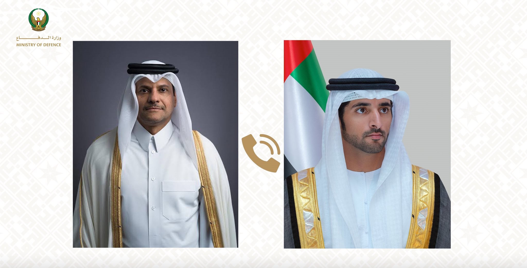 أعلنت وزارة الدفاع أن سمو الشيخ حمدان بن محمد بن راشد آل مكتوم، ولي عهد دبي، نائب رئيس مجلس الوزراء، وزير الدفاع، تلقى اتصالاً هاتفياً من الشيخ سعود بن عبدالرحمن بن حسن آل ثاني، نائب رئيس مجلس الوزراء ووزير الدولة لشؤون الدفاع في دولة قطر، جرى خلاله بحث عدد من القضايا ذات الاهتمام المشترك، لا سيما التطورات التصعيدية الخطيرة التي تشهدها المنطقة وتداعياتها على الأمن والاستقرار الإقليميين، حيث أكد الجانبان أهمية مواصلة التنسيق والتشاور بما يسهم في خفض التوتر ودعم جهود تعزيز الأمن والاستقرار في المنطقة.