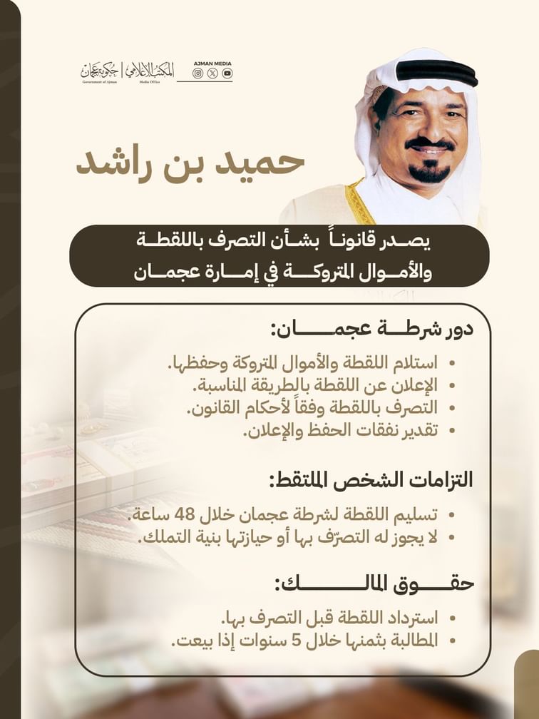 أصدر صاحب السمو الشيخ حميد بن راشد النعيمي عضو المجلس الأعلى حاكم عجمان، القانون رقم (2) لسنة 2026 بشأن التصرف باللقطة والأموال المتروكة في إمارة عجمان.