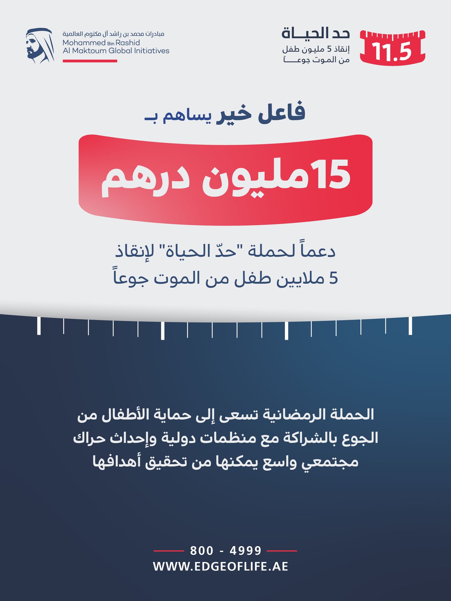 ساهم فاعل خير بمبلغ 15 مليون درهم في حملة "حد الحياة" لإنقاذ 5 ملايين طفل من الموت جوعاً، والتي أطلقها صاحب السمو الشيخ محمد بن راشد آل مكتوم نائب رئيس الدولة، رئيس مجلس الوزراء حاكم دبي "رعاه الله، بالتزامن مع شهر رمضان الكريم، لجمع مليار درهم على الأقل يتم استثمارها في مكافحة جوع الأطفال في العالم.