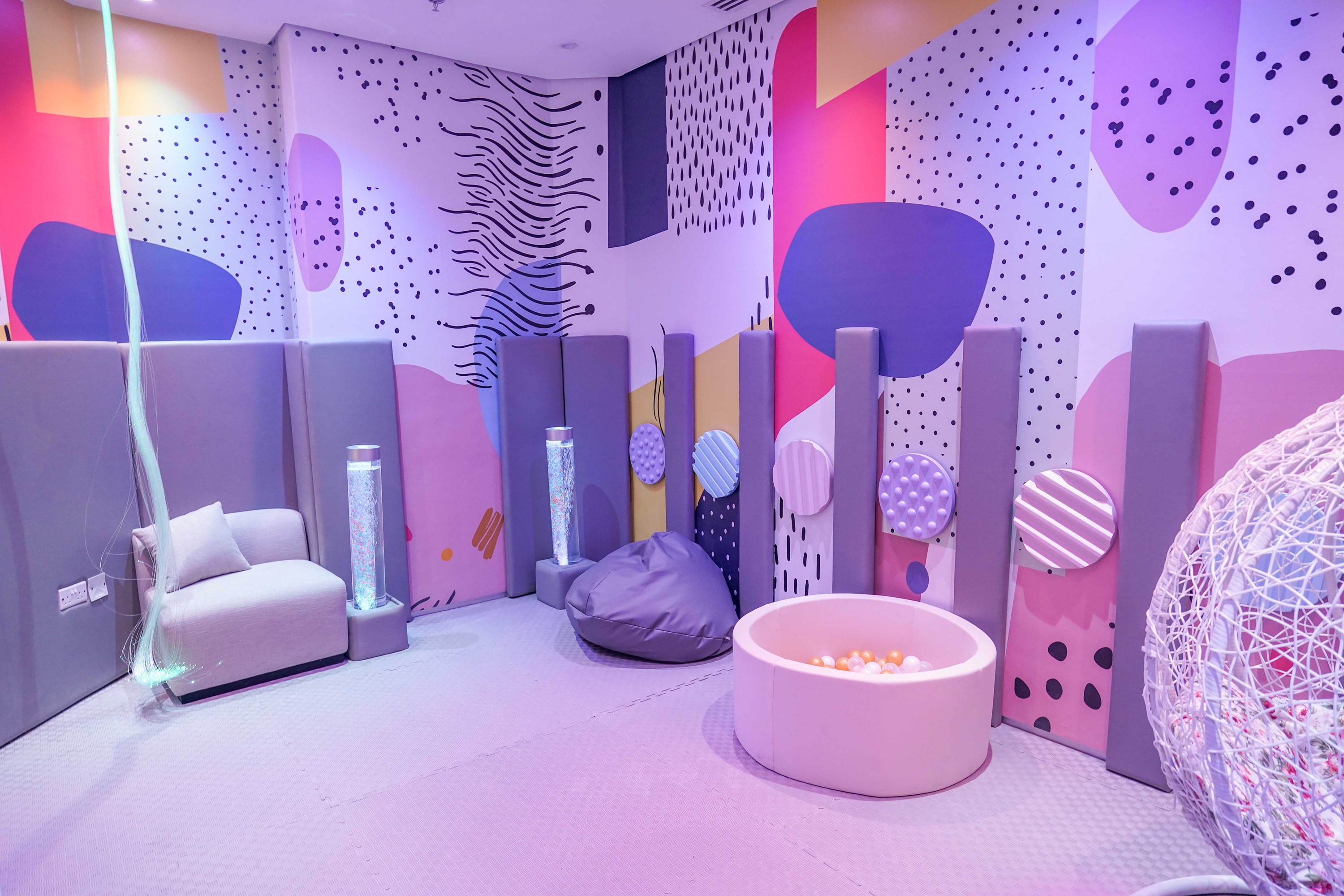 وتُعدّ "الغرف الحسّية" بيئة مصممة بعناية لتوفير تجربة تساعد على تحقيق التوازن بين الاسترخاء والتحفيز، بما يتناسب مع الاحتياجات الفردية لذوي التوحّد. وتشمل هذه الغرف مجموعة من العناصر المتطورة، أبرزها أنظمة إضاءة ذكية خافتة تهيئ أجواء مريحة، وعناصر تفاعلية مثل الأراجيح لتعزيز الراحة الجسدية، إضافة إلى مؤثّرات سمعية وبصرية تجمع بين الموسيقى الهادئة والمشاهد الطبيعية والمناظر الملونة، بما يسهم في تقليل التوتر الحسّي.